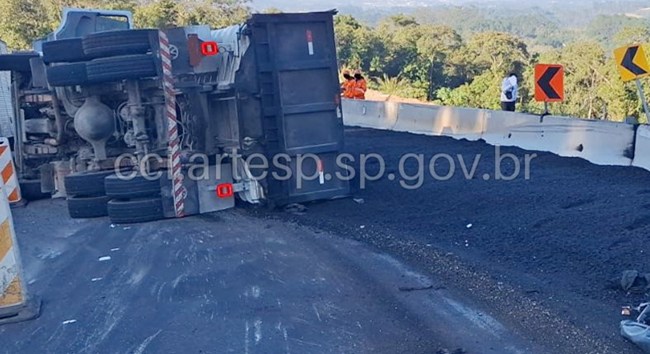 Nesta segunda-feira (14), um caminhão carregado de massa asfáltica tombou no km 49,2 da Raposo Tavares, em São Roque. Segundo a Artesp – Agência Reguladora do Transporte de São Paulo, o condutor do caminhão alegou que trafegava pela rodovia no sentido interior, quando perdeu o freio do veículo vindo a perder também o controle da direção, em seguida sofreu o tombamento, ficando imobilizado no local. O motorista não teve nenhum ferimento. O trânsito teve que ser desviado para a faixa do sentido contrário da rodovia. A carga ficou espalhada pela pista e teve que ser removida nas horas seguintes.