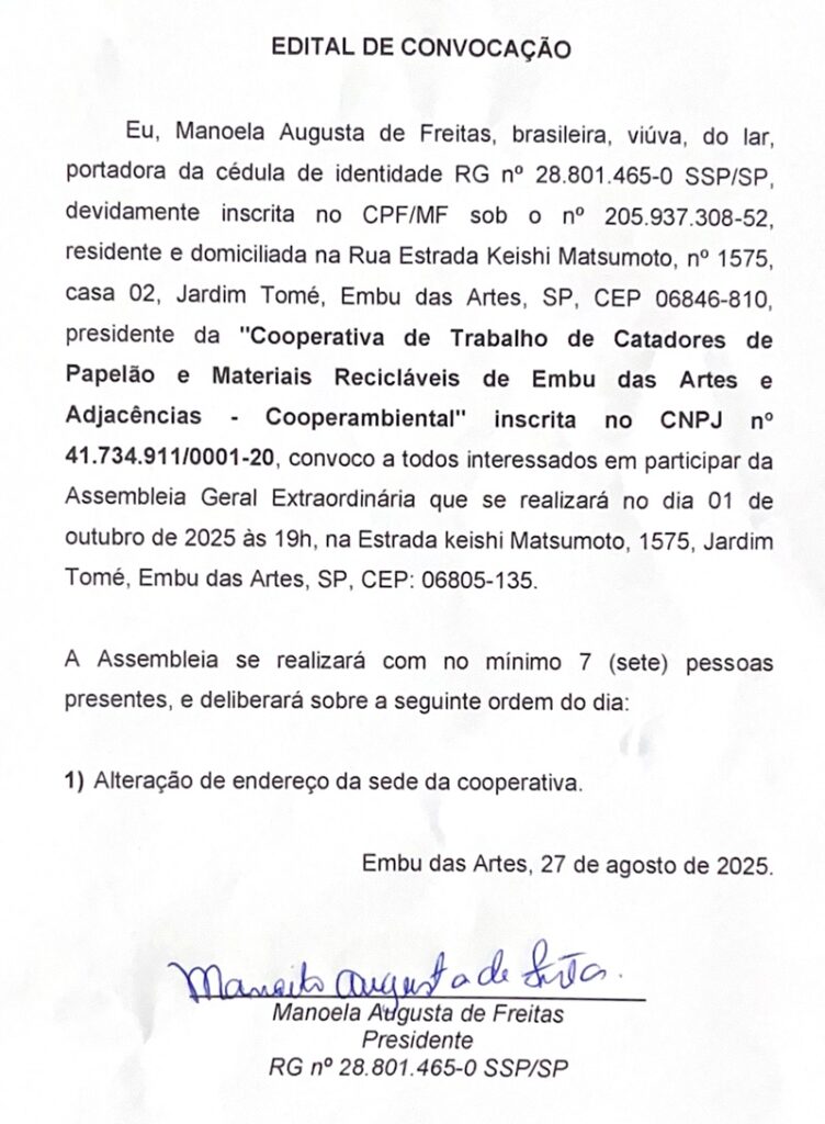Edital de Convocação – Assembleia Geral Extraordinária – Cooperambiental