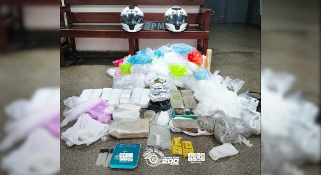 Na noite de terça-feira (17), em Carapicuíba, policiais militares estavam em patrulhamento preventivo e localizaram um imóvel utilizado para armazenamento e fracionamento de drogas. Durante a ronda, os PMs visualizaram um bandido portando uma sacola, que fugiu ao perceber a presença policial, abandonando o objeto em uma viela. Em continuidade à ação, os policiais avançaram pelo local e identificaram um imóvel aberto, constatando tratar-se de uma estrutura utilizada para o armazenamento e preparo de entorpecentes. No interior do local, foram apreendidos 13 tijolos e oito sacolas de maconha, um tijolo de crack, uma sacola contendo ecstasy e 132 frascos de lança-perfume, além de materiais utilizados para embalo e cadernos com anotações relacionadas à comercialização das drogas. O material e as drogas apreendidas foram encaminhadas ao Distrito Policial, permanecendo à disposição da Justiça.
