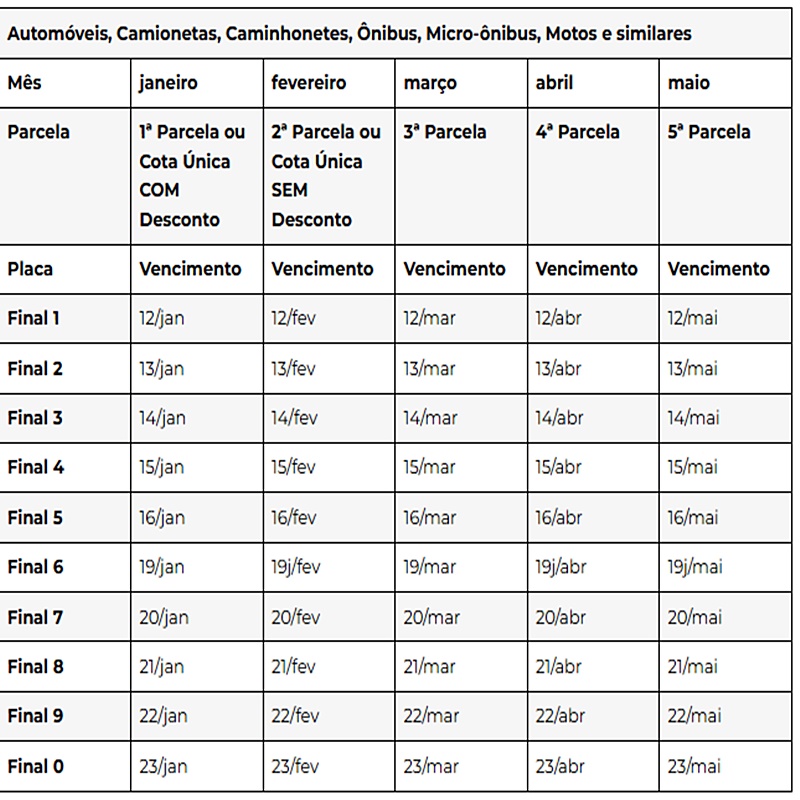 Os caminhões têm prazos diferenciados: para o pagamento integral em janeiro é concedido desconto de 3%; aos que escolherem pagar em cota única, sem desconto, é 22 de abril. Para os proprietários que optarem pelo parcelamento em três, quatro ou cinco vezes, sem desconto, os vencimentos são em 20 de março, 20 de maio, 20 de julho, 20 de agosto e 20 de setembro.