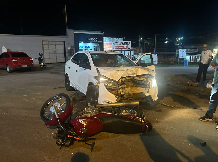 Um motociclista ficou ferido após uma colisão envolvendo uma motocicleta Honda Titan e um automóvel Chevrolet Prisma, registrada na noite desta terça-feira (27), em Jaru. O acidente aconteceu no cruzamento da Avenida Padre Adolpho Rhol com a Rua Nilson In?