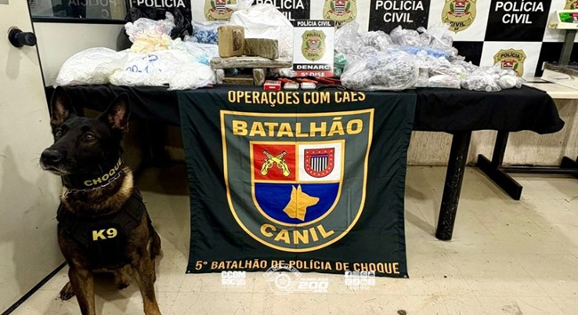 Policiais militares do 5º Batalhão de Polícia de Choque apreenderam mais de 50 quilos de entorpecentes no Jardim Nossa Senhora de Fátima, em Embu das Artes, com o auxílio do cão Malinois Rollo, durante uma operação de combate ao tráfico de drogas e ao crime organizado. A ação ocorreu na favela Morro da Fátima, onde as equipes realizaram uma varredura de detecção de drogas. O cão indicou odor suspeito proveniente de uma edificação inabitada, que foi vistoriada pelos policiais. No local, foram encontrados aproximadamente 31,2 kg de maconha, 19,9 kg de cocaína e 350 gramas de crack, totalizando cerca de 51,1 kg de drogas. Também foram apreendidas seis tesouras de corte e três balanças de precisão. A ocorrência foi apresentada à 5ª Delegacia de Investigações sobre Entorpecentes.