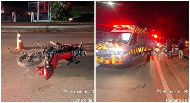 Um grave acidente vitimou o condutor de uma moto na madrugada desta sexta-feira (27) em Ibiúna. De acordo com informações da Artesp – Agência Reguladora do Transporte em São Paulo, a moto Honda XRE 300 seguia com dois ocupantes por volta da 1h40 da madrugada, no km 66, no sentido Cotia, quando o condutor perdeu o controle da direção e chocou-se com a defensa metálica (guard-rail), vindo a sofrer tombamento. Com o impacto, o rapaz que dirigia a moto teve uma forte queda, chegou a ser socorrido pelas equipes de resgate, mas não resistiu aos ferimentos. A outra pessoa também foi socorrida, mas com ferimentos leves.