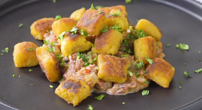 Em uma frigideira com azeite, refogar os nhoques até que fiquem dourados de todos os lados. Servir com a carne seca cremosa.