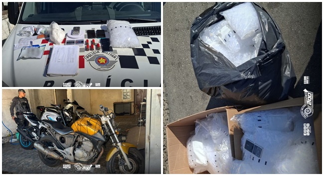 A Polícia Militar prendeu um homem em flagrante, na manhã de domingo (27), em Carapicuíba. O criminoso estava com duas motocicletas roubadas, além de drogas, munições e diversos objetos de origem duvidosa. A ocorrência teve início quando policiais receberam a denúncia de uma empresa de monitoramento veicular sobre o rastreamento da moto furtada no sábado (26), em Osasco. O sistema apontava a última localização do veículo em um endereço na Vila Dirce, em Carapicuíba. Ao chegarem no local, os policiais não encontraram a moto no ponto indicado, mas durante as diligências perceberam uma com características semelhantes no quintal de uma residência. A moradora autorizou a entrada da equipe e informou que os veículos estacionados pertenciam ao morador do pavimento térreo. Dentro do imóvel, os PMs abordaram o criminoso, que demonstrou nervosismo ao ser questionado e foi constatado que o morador já tinha passagem por receptação. Durante a vistoria, os policiais encontraram uma moto furtada e outra roubada, que estava com o chassi suprimido, 578g de pasta base de cocaína, grande quantidade de pinos vazios, cartuchos calibre .12, cartões bancários em nomes diversos, folhas de cheque somando R$ 123.583,68, além de celulares, chips e anotações ligadas ao tráfico. Diante do flagrante, o homem foi conduzido ao 1º Distrito Policial de Carapicuíba, onde permaneceu preso pelos crimes de tráfico de drogas, posse irregular de munição, adulteração de sinal identificador de veículo e receptação. As duas motocicletas foram devolvidas aos proprietários após perícia.