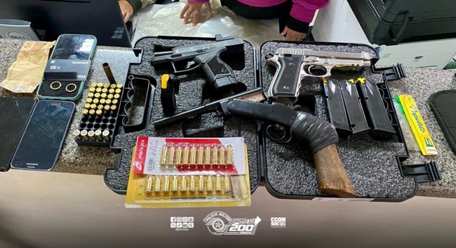 Quatro bandidos foram presos em flagrante após um roubo com retenção de vítimas em uma chácara em Ibiúna. A equipe de radiopatrulhamento da Polícia Militar foi acionada para atender a ocorrência. Ao chegar no local, os policiais constataram movimentação suspeita e iniciaram a entrada no imóvel, com apoio do helicóptero Águia e de outras viaturas que realizaram o cerco da área. Durante a tentativa de fuga, dois criminosos tentaram escapar utilizando o veículo de uma das vítimas, mas foram detidos imediatamente. Um terceiro se rendeu, enquanto o quarto foi capturado ao tentar fugir pelos fundos da propriedade. No interior do imóvel, os policiais encontraram cinco vítimas que estavam amarradas. Todas foram libertadas sem ferimentos. Na ação, foram apreendidos dois revólveres calibre 9mm, uma garrucha, 38 munições calibre 9mm, 15 munições calibre .38, uma munição calibre 36, além de objetos pessoais das vítimas, como alianças, celulares, um cartão bancário, um relógio, R$ 160,00 em dinheiro e uma porção de maconha. A ocorrência foi registrada na Delegacia de Ibiúna, pelos crimes de roubo, porte ilegal de arma de fogo e posse de entorpecentes. Os quatro ladrões permaneceram à disposição da Justiça.
