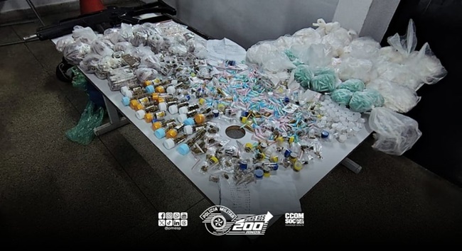 Equipes do 5º Baep – Batalhão de Ações Especiais de Polícia prenderam dois criminosos por tráfico de drogas na Estrada Velha da Olaria, no Arco Íris, em Cotia. Os policiais avistaram dois homens carregando mochilas e, ao notarem a presença da viatura, tentaram fugir por áreas residenciais próximas. Ambos foram capturados logo em seguida. Na abordagem, foram localizadas 1.585 porções de maconha com um dos bandidos. Com o outro, os policiais encontraram 2.624 porções de cocaína e 125 porções de crack, todas embaladas e prontas para comercialização. Questionados, os criminosos confessaram envolvimento com o tráfico e indicaram aos policiais o endereço onde moravam. No local, foi localizado um simulacro de arma. A ocorrência foi apresentada na Delegacia de Cotia. Os dois homens permaneceram à disposição da Justiça, autuados por tráfico de entorpecentes.