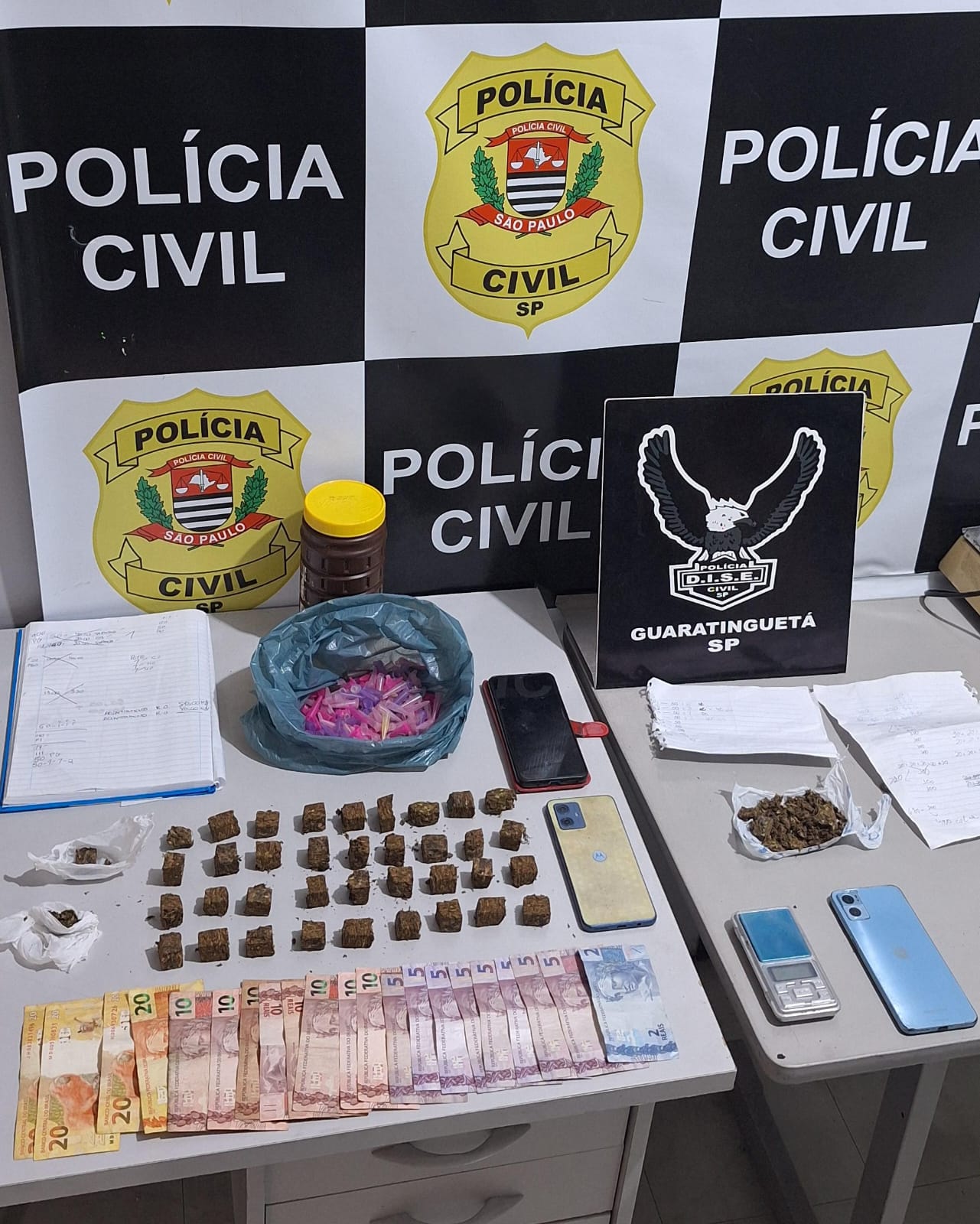 Operação da DISE apreendeu maconha, caderno de anotações e balança de precisão.