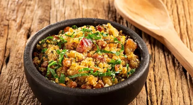 Ingredientes:300g de grão-de-bico2 folhas de louro4 colheres (sopa) de azeite1 cebola picada2 dentes de alho amassado2 ovos batidos1/2 maço de couve fatiada2 xícaras (chá) de carne-seca cozida e desfiada1 xícara (chá) de farinha de milho2 xícaras (chá) de farinha de mandiocaSal e cheiro- verde picado a gosto Modo de preparo:Coloque o grão-de-bico em uma tigela, cubra com água e deixe de molho por 4 horas.Escorra, coloque em uma panela de pressão com o louro e cubra com água.Tampe e cozinhe por 20 minutos depois de começar a chiar.Desligue e deixe sair a pressão.Abra a panela e escorra o líquido.Aqueça uma panela com o azeite e frite a cebola e o alho até dourar.Adicione os ovos e frite por 2 minutos.Junte a couve e refogue até murchar.Adicione a carne-seca e refogue por mais 2 minutos.Acrescente o grão-de-bico escorrido, as farinhas, tempere com sal e cheiro-verde, misture e desligue o fogo. Por Renata Otaviano – Guia da Cozinhahttps://www.terra.com.br/vida-e-estilo/degusta/receitas/grao-de-bico-tropeiro-comida-afetiva-de-dar-um-quentinho-no-coracao,5f88df3fbc2185a20f2eb0e959893e6a7rasvkjp.html