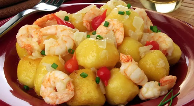 Junte o camarão e refogue por 4 minutos. Tempere com sal, pimenta e cheiro-verde. Volte o nhoque para a frigideira e misture delicadamente com o molho de camarões