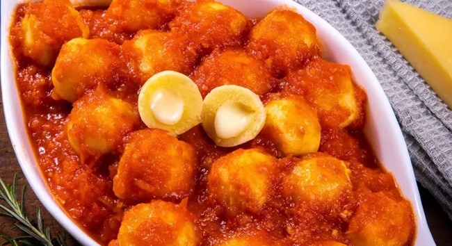 Ingredientes:1kg de mandioquinha cozida e espremida2 colheres (sopa) de manteiga1 envelope de caldo de galinha em pó1 ovo1 xícara (chá) de maisena1 xícara (chá) de farinha de trigo (aproximadamente)Sal a gosto2 xícaras (chá) de queijo provolone em cubosFarinha de trigo para empanarOvos batidos para empanarFarinha de rosca para empanarÓleo para fritarQueijo parmesão ralado para polvilhar Molho:8 tomates picados3 colheres (sopa) de azeite1 dente de alho picado1 cebola raladaSal e pimenta-do-reino a gosto Modo de preparo:Para o molho, bata metade dos tomates no liquidificador e reserve.Aqueça uma panela com o azeite, em fogo médio, e frite o alho e a cebola por 2 minutos.Adicione os tomates restantes picados e refogue por 3 minutos.Acrescente o tomate batido, abaixe o fogo e cozinhe por 15 minutos, mexendo de vez em quando.Tempere com sal, pimenta e cozinhe até encorpar. Desligue e reserve.Em uma panela, misture a mandioquinha, a manteiga, o caldo de galinha e o ovo até ficar homogêneo.Leve ao fogo baixo, adicione a maisena, a farinha e mexa com uma colher de pau até desgrudar do fundo da panela.Se necessário, adicione mais farinha. Tempere com sal e desligue.Abra pequenas porções da massa na mão, divida os cubos de queijo entre elas e feche, modelando bolinhas.Passe em farinha de trigo, em ovos batidos e empane na farinha de rosca.Frite, aos poucos, em óleo quente, até dourar.Escorra sobre papel-toalha, transfira para um refratário, cubra com o molho e polvilhe com parmesão. Sirva em seguida. Por Renata Otaviano / Guia da Cozinhahttps://www.terra.com.br/vida-e-estilo/degusta/receitas/nhoque-frito-recheado-com-queijo-aprenda-a-delicia-crocante,831b8b56a67e8feff70ee54dcc830f06b9o9hv7x.html?utm_source=clipboard