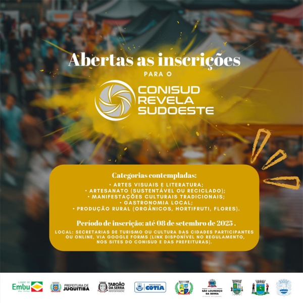 Até 8 de setembro, artistas, artesãos, grupos culturais, da cultura tradicional, produtores locais e da culinária regional poderão se inscrever para participar desta grande mostra, o Revela Sudoeste, que abrange os municípios do Conisud – Consórcio Regional da Região Sudoeste.
