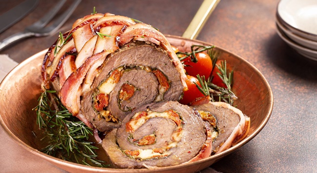 Ingredientes500 g de patinho aberto em manta1/2 cebola ralada1 dente de alho picadinho3 colheres de sopa de azeite1 colher de sopa de mostarda1 colher de sopa de sal½ xícara de chá de salsinhaPimenta do reino a gosto300g de bacon em fatias Recheio:1 maço de espinafre picadoSal a gostoOrégano a gostoPimenta a gosto1 colher de sopa de azeite100 g de tomate seco picadinho100g de queijo branco em cubos pequenos Modo de preparoAbra a manta de patinho e coloque todos os temperos sobre ela, exceto o bacon. Misture bem sobre toda a carne e deixe na geladeira por cerca de 2h ou até de um dia para o outro. Passado o descanso, abra a manta e recheie com o espinafre, tomate seco, queijo branco e todos os temperinhos. Enrole a manta de forma cilíndrica e envolva-a com as fitas de bacon trancando-as. Leve ao forno pré aquecido a 180 graus por cerca de 40 minutos. Fatie e sirva com batatas, arroz ou outro acompanhamento de sua preferência. Do Minerva Foodshttps://minervafoods.com/receitas/rocambole-de-carne-envolto-no-bacon-recheado-com-espinafre-tomate-seco-e-queijo-branco-2/