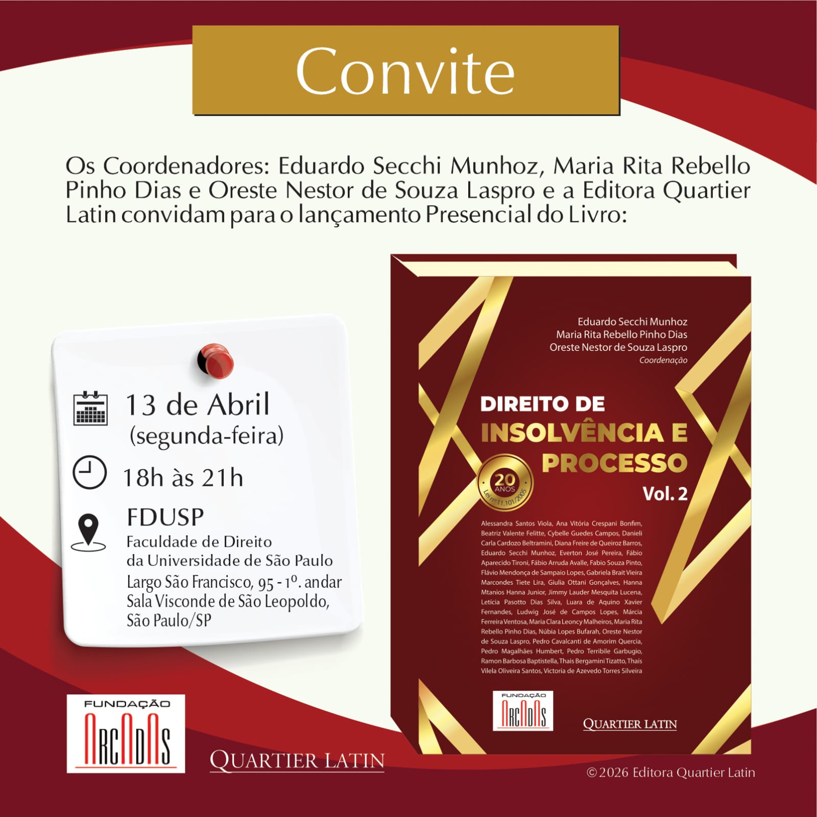 Na próxima segunda-feira (13/4), o Grupo de Estudos Avançados de Recuperação Judicial e Falência da Fundação Arcadas lançará o segundo volume da obra coletiva Direito de Insolvência e Processo. O evento será promovido na Sala Visconde de São Leopoldo, na Faculdade de Direito da USP (FDUSP…
