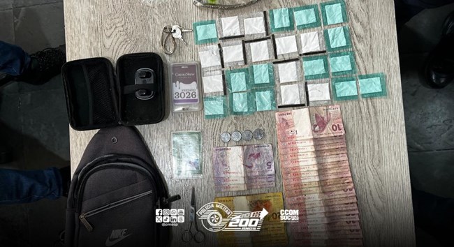 O homem foi abordado e, após busca pessoal, os policiais localizaram em sua pochete a quantia de R$ 307,00 em dinheiro, além de 34 porções de cocaína (34,59g), nove porções de maconha (20,8g) e três porções de crack (3,11g).